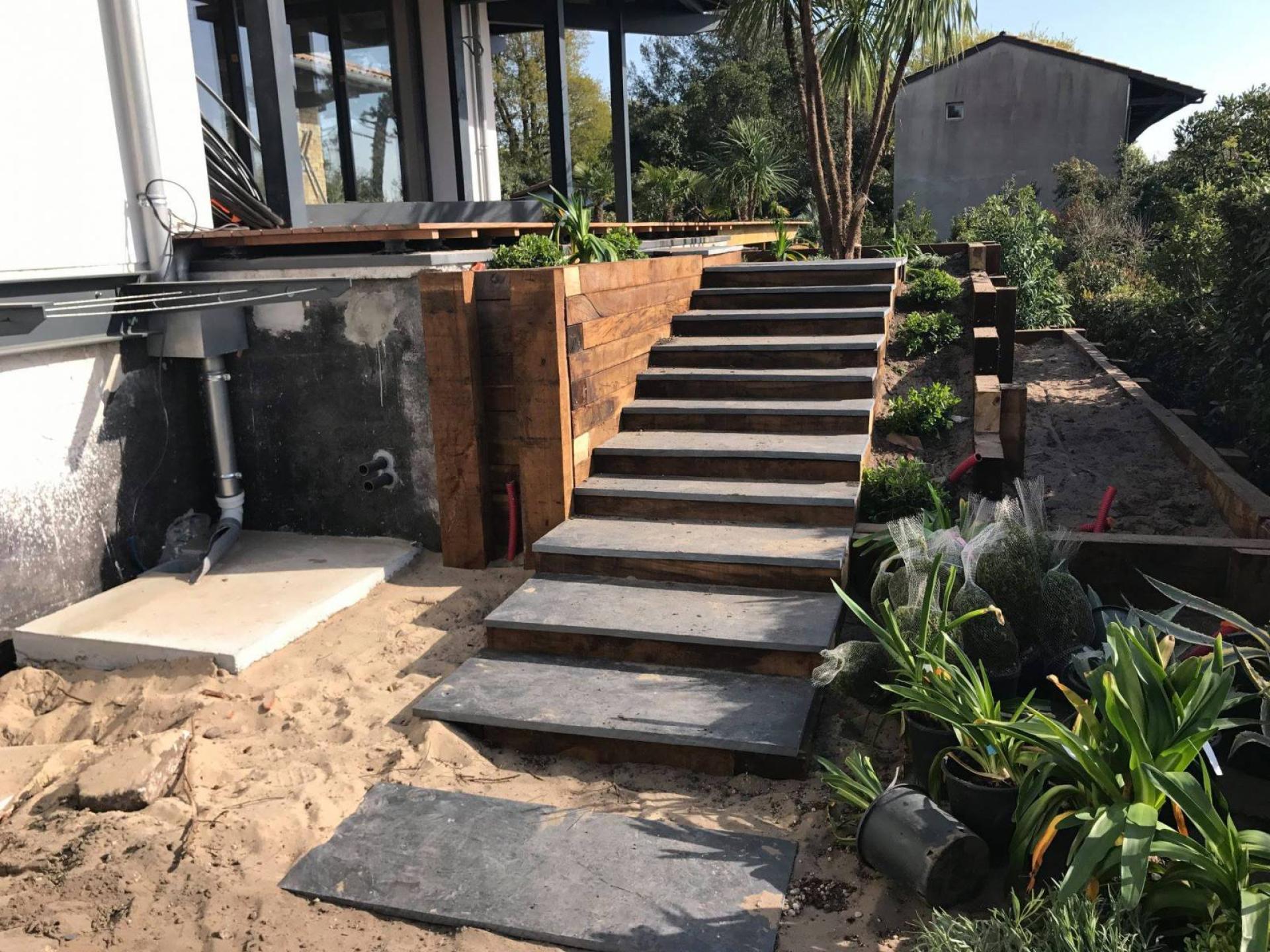 Au Pyla Sur Mer, l'équipe des Paysages d'Antoine, vous présente la création d'un escalier en dalles d'ardoises avec mur et contremarches en traverses de chênes .