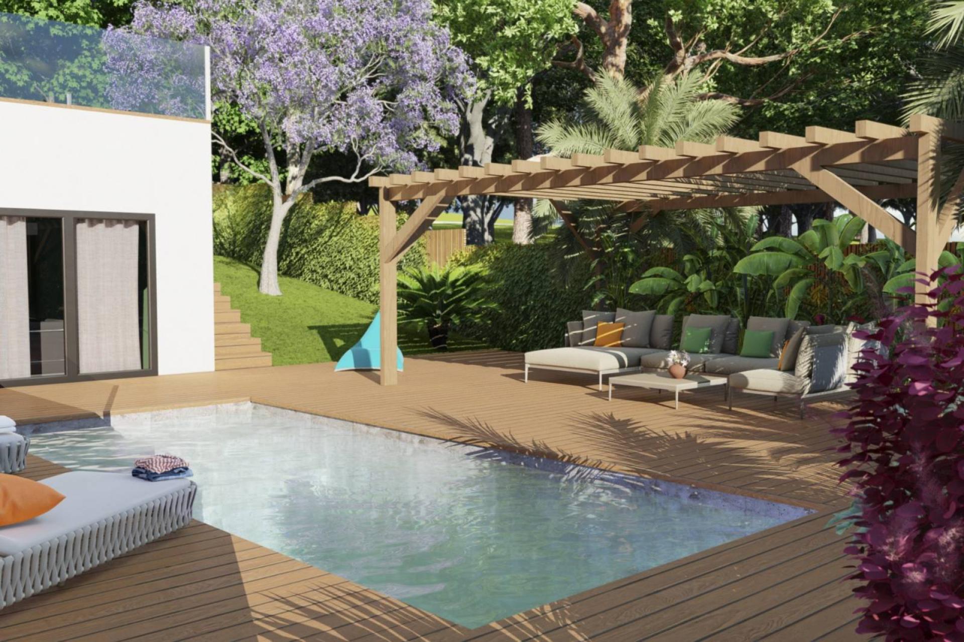 Retour sur la conception d'une villa. Une ambiance tropical soutenue pas la palette végétal ainsi que la pierre de bali pour l'intérieur de la piscine. Une terrasse en bois pour apporteur de la chaleur au niveau des couleurs et des materiaux, accompagné d'une pergola pour ou se trouve un salon d'extérieur pour les soirées estivales. Un client comblé par le projet qui verra le jour en 2024.
